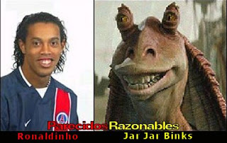La única parodia que lamento que se parezcan en físico (porque son igualitos) son Ronaldinho Gaúcho con Jar Jar... ya que el primero me parece un jugador de primera y el segundo... pues... ¿como comprenderán que si me enseñan a hacer un origami de dicho personaje le hago una quema pública? XD